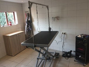 De trimsalon heeft een trimtafel, die in hoogte verstelbaar is. Zo kan ik uw hond op de juiste hoogte behandelen. de trimsalon beschikt over een eigen warmwatervoorziening. Op de foto hieronder ziet u een groot bad waar alle honden in worden gewassen. Dit bad is groot genoeg voor alle soorten honden die hier over de vloer komen. Er hangt tevens een airco in de trimsalon zodat als het in de zomer warm weer is de hond in een comfortabele temperatuur wordt behandeld. In de winter kunnen we de ruimte ook heerlijk verwarmen.
